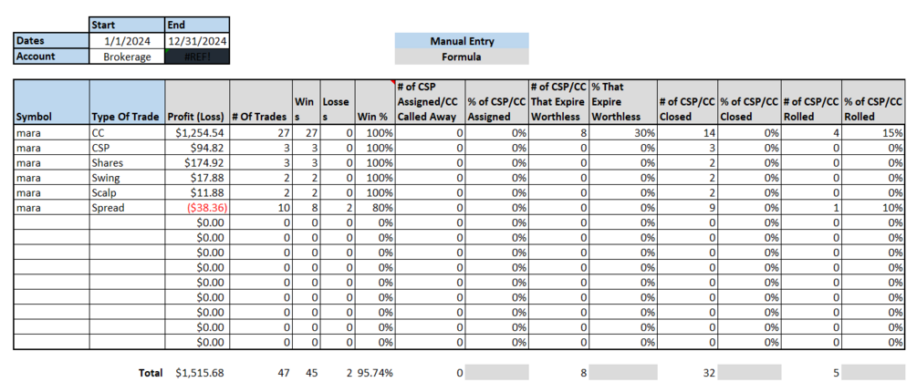 - Comprehensive Tracking: Record every detail of your trades, from Covered Calls and Cash Secured Puts to Scalps and Dividends. This tool captures everything from Leaps to Interest Payments, ensuring no trade goes unlogged.